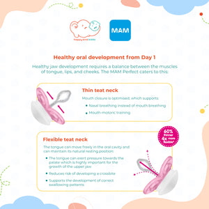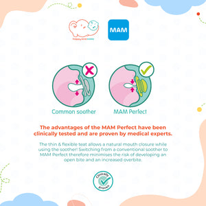 MAM Perfect has the thinnest and most flexible teat of all pacifiers in the market. This is an important feature to reduce the risk of misaligned teeth.