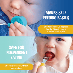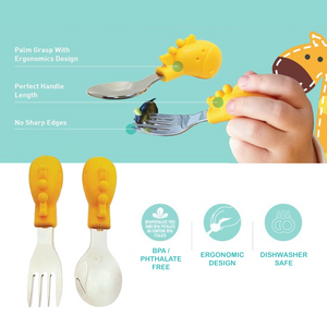 Parents found that their kids would get frustrated with the longer fork & spoon set and lose their appetite. We shortened our regular fork and spoon set and turn the handle 90 degrees so the utensils will fit more easily into a toddler’s palm grip. This makes self feeding easier and much more enjoyable for junior before they transition to our regular Kid’s fork & spoon set.