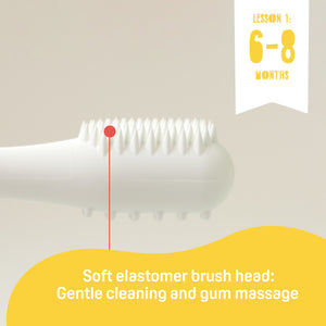 - Lesson 1 (Yellow): Insert the safety shield from the toothbrush head. Push the safety shield down until it snaps on securely. Allow your baby to massage their teeth and gums gently.