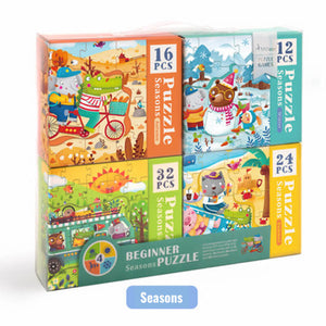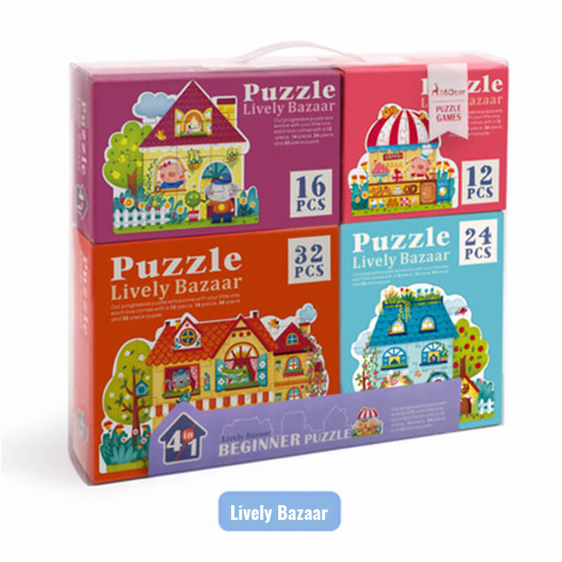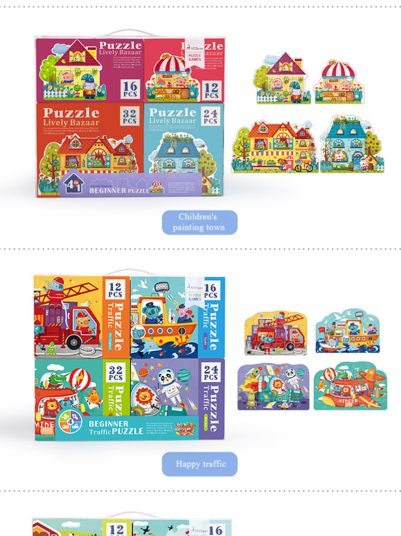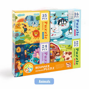 - Four puzzles in one box with minimum 12 pcs puzzles, up to 32 pieces! (35 for animal design)