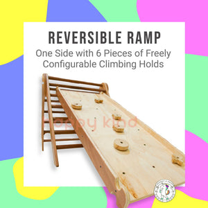 Unicraft Pikler Triangle comes with a reversible ramp - one side is slide, another side is for climbing with 6 climbing holds.˜