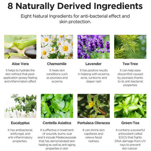 - Made of 8 natural ingredients which have antibacterial and skin protection effects: Aloe leaf juice, Chamomile tea, Lavender, Tea tree oil, Blue dragonfly essential oil, Centella asiatica extract, Purslane, Green tea essential oil.