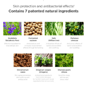 Made of 7 natural extracts (fermented bean, willow tree, portulaca, cinnamon, oregano, cypress tree, root of skullcap) which has antibacterial effects and protects the skin.