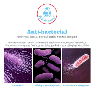 Uses: To remove all germs (salmonella, vibrio parahaemolyticus, pseudomona aeruginosa), tough stains from all toys and durable goods.