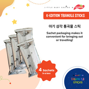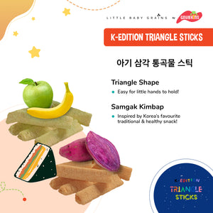 Introducing Gnubkins' K-Edition Triangle Sticks - a tasty snack designed for 6M+ babies! Here, we take snacking to new heights of deliciousness; with organic ingredients and Korean-inspired samgak kimbap and mini packs, these snacks are sure to upgrade your little one's snacktime.